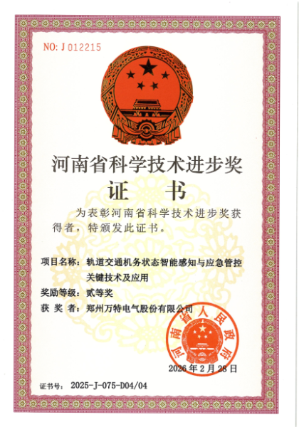 近日,鄭州萬特電氣股份有限公司憑借“軌道交通機(jī)務(wù)狀態(tài)智能感知與應(yīng)急管控關(guān)鍵技術(shù)及應(yīng)用”項(xiàng)目,榮獲2025年度河南省科學(xué)技術(shù)進(jìn)步獎(jiǎng)貳等獎(jiǎng),彰顯了公司勇于創(chuàng)新的進(jìn)取精神。